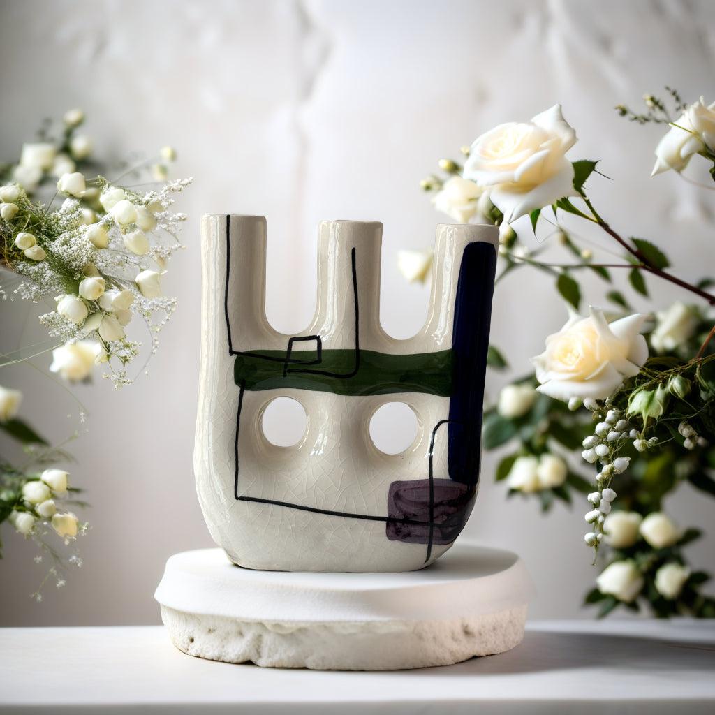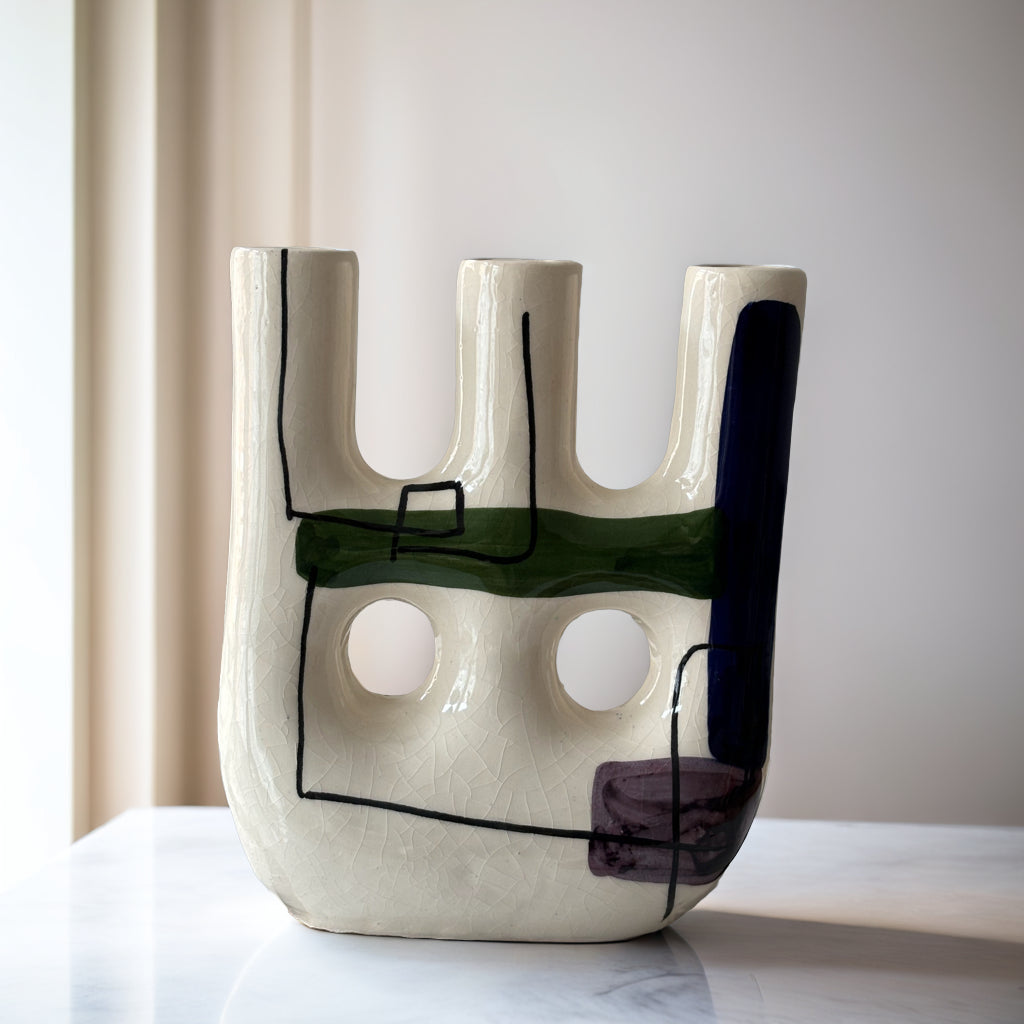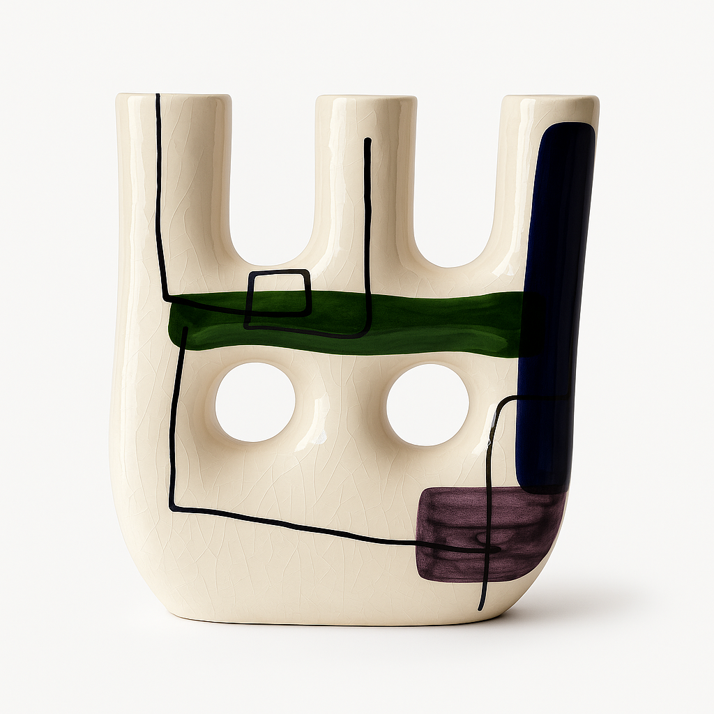 Its three vertical towers mimic rooftop structures found in the medina; its negative space creates a rhythmic balance between form and air. The vase features hand-drawn abstract lines, flowing like pathways through ancient walls. It’s both a sculpture and a vessel, inviting interpretation, light, and conversation.