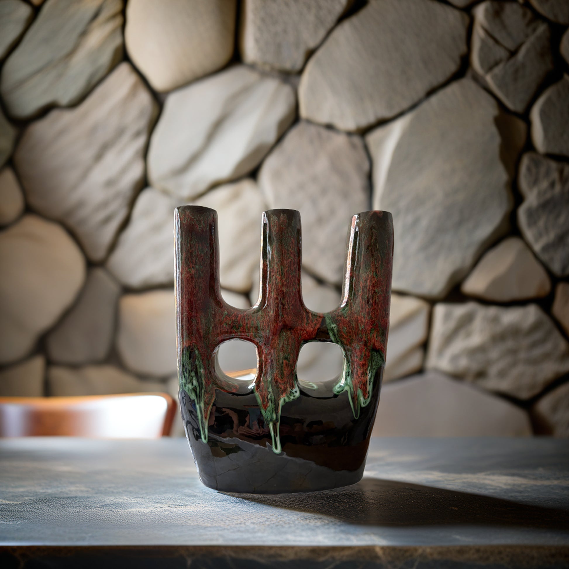 With its triple-chambered silhouette and carved-out windows, Kasbah Lines is a tribute to North African kasbahs — the fortified cities that rise from desert landscapes. The vase’s architectural form is softened by cascading glazes of deep red, forest green, and ash black, evoking the weathered stone and volcanic soil of the region.