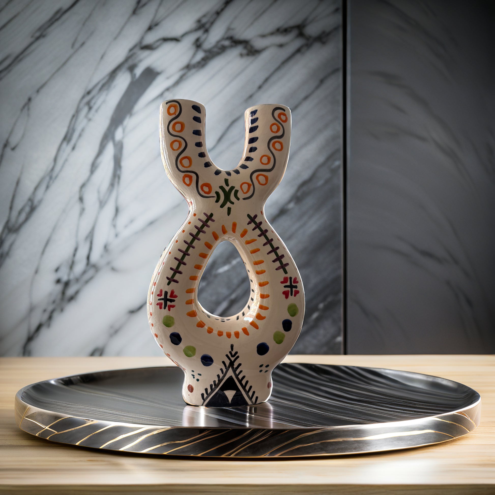 Shaped in Marrakech from local red clay, the Tazra Vase stands out with its double-neck silhouette and open center — a shape echoing ancient talismans and doorways of desert kasbahs. The hand-painted motifs, from looping spirals to tiny protective crosses, flow like stitched embroidery across the surface. Each brushstroke is a thread, connecting the piece to Amazigh heritage and contemporary design.